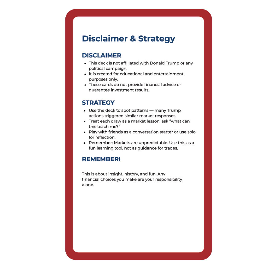 The Tump Market Trends Deck is a collectible set of 55 premium trading cards that decode how global and U.S. political triggers move the markets. Each card features a key event — with a data-backed breakdown of which assets rise or fall.